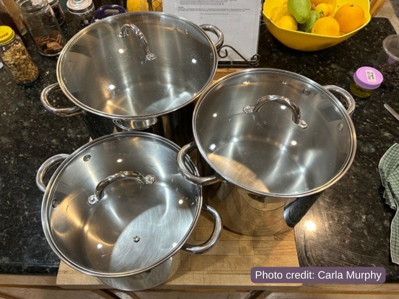 Carla says, “These heavy-bottom pots are excellent for cheesemaking. Milk doesn’t scorch with these heavy-bottom pots, they nest nicely for storage, and they even hang easily by their lids.”